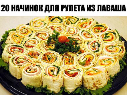 20 начинок для рулетиков из лаваша. 1. Крабовые палочки, немного чеснока, вареное яйцо, сыр, зелень и майонез. 2. Творог, соль, зелень, чеснок, майонез.