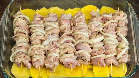 Куриный шашлык с картошкой в духовке. Ингредиенты: Филе куриное (из бедра) — 1,5 кг Лук репчатый — 4 шт Соль (по вкусу) Перец черный (молотый, по вкусу)