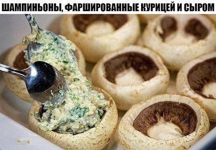 Шампиньоны, фаршированные курицей и сыром, получаются сытными и оригинальными на вкус.. Ингредиенты: 500 г куриного филе 60 г феты 10 больших свежих шампиньонов