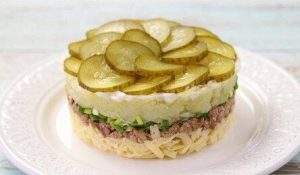 Салат из печени трески — очень вкусное блюдо. Для приготовления понадобятся: банка печени трески (230 г), 100 г сыра, 1-2 отварные картофелины, 1-2 маринованных огурца и зеленый лук. Также понадобится майонез.